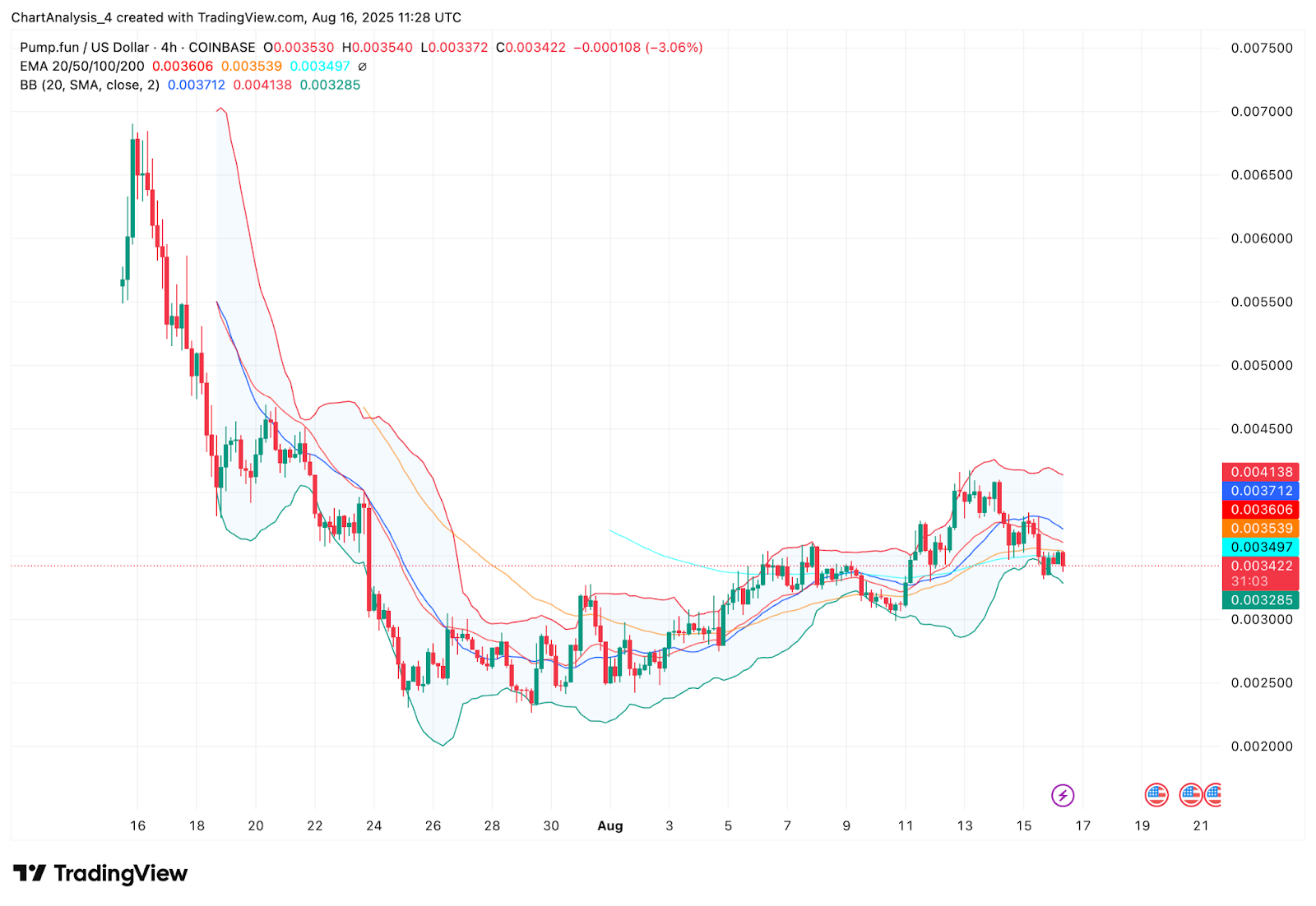 The Bollinger Bands on the 4-hour chart are expanding downward as price moves closer to the lower band near $0.00328. This suggests volatility expansion to the downside. The EMA alignment is also bearish, with the 20, 50, and 100 EMA lines now positioned above price.
