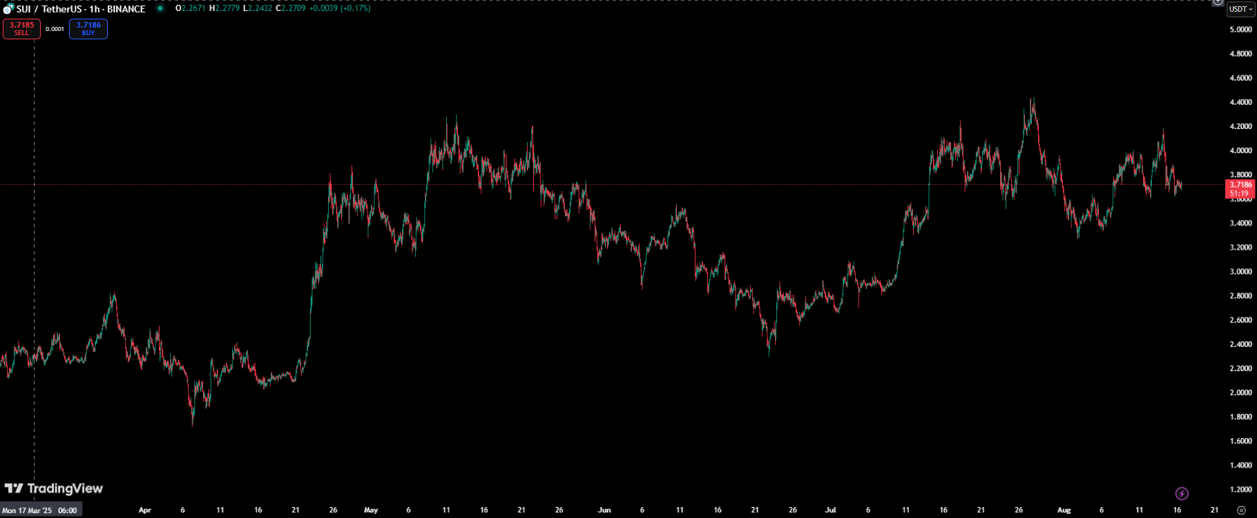 SUI has quietly gained traction in 2025, with its DeFi ecosystem seeing a 42% surge in Total Value Locked (TVL) since January. Currently trading around $3.82, forecasts call for $4.75–$5.00 by late August, with long-term targets between $12 and $14 by October 2025.