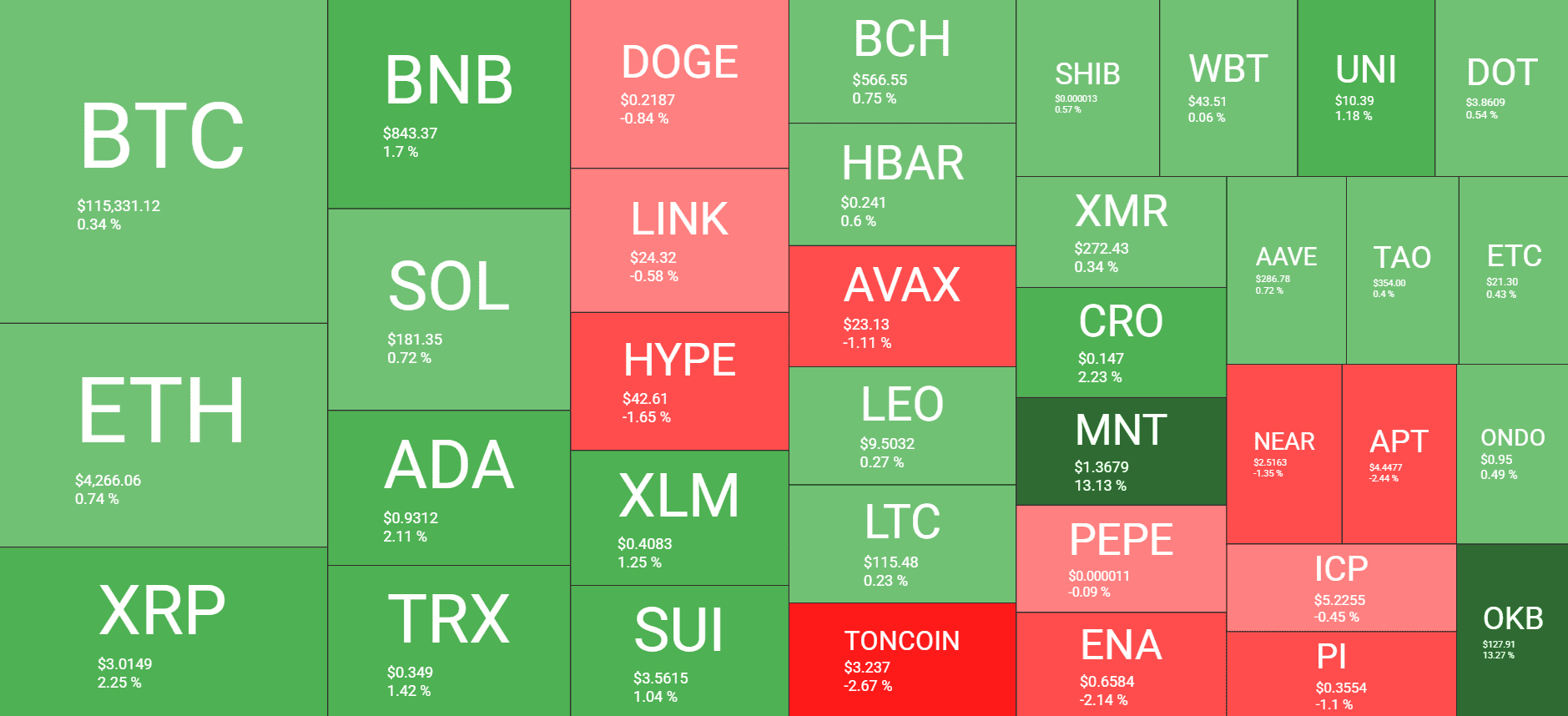 The weekend was a lot calmer as BTC spent it trading sideways around $118,000. However, the landscape took another turn for the worse on Monday when the cryptocurrency slipped to an 11-day low of just under $115,000 as the markets braced for the meeting between Zelenskyy and European leaders on one side and US President Trump on the other.