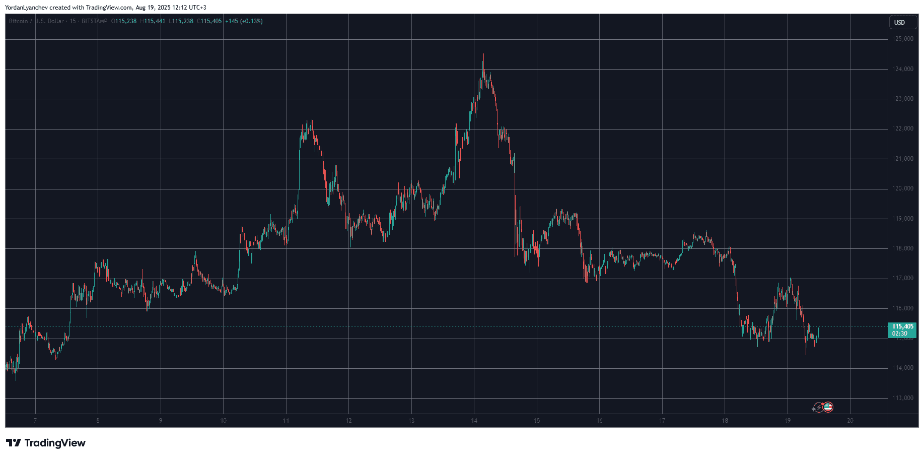 Although both parties said there was some progress made and Trump even promised security guarantees to Ukraine, BTC failed at $117,000 and quickly slipped below $115,000 earlier this morning. It has bounced to over that level as of now, but still struggles with a 3% weekly drop.