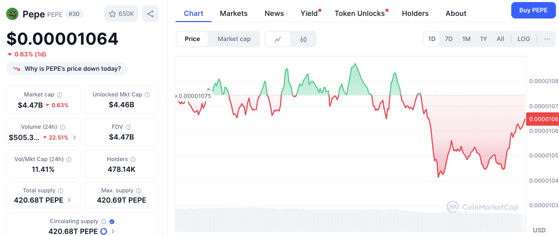Meanwhile, PEPE shows a sharper slowdown, slipping 1.19% to $0.00001061. More concerning is its 21% drop in daily trading volume, signaling fading participation.
