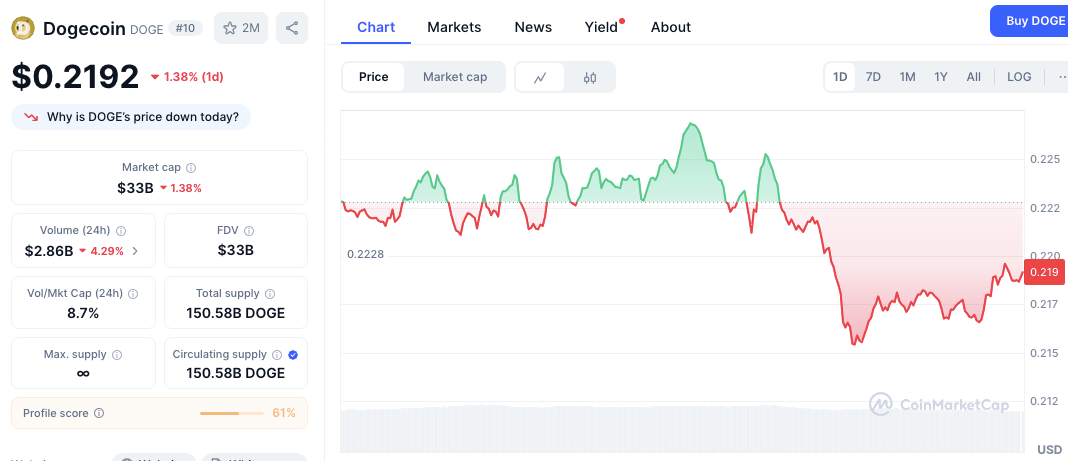 Dogecoin remains the largest in this group, priced at $0.2187 with a $32.9B market cap. The coin briefly surged to $0.225 before retreating toward $0.215. This level has acted as a strong floor, cushioning further decline.