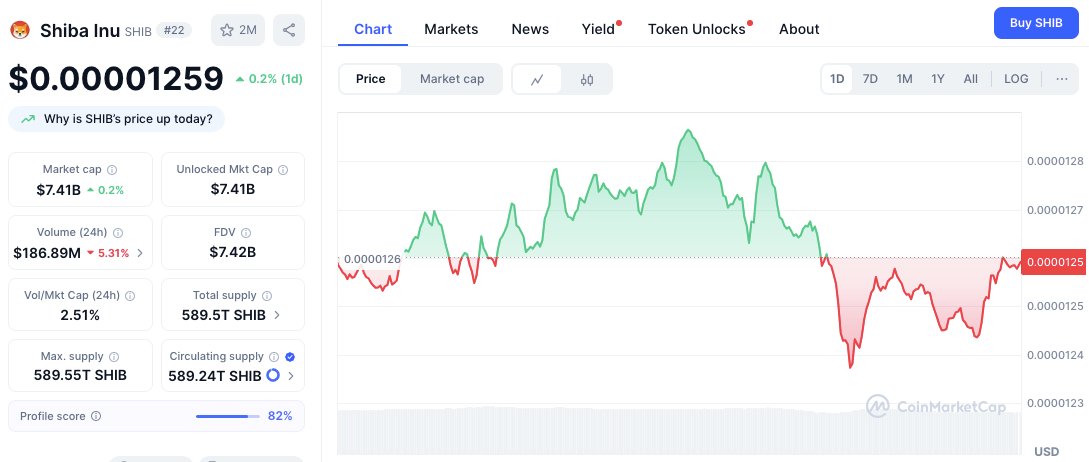 Shiba Inu is trading at $0.00001258, with a mild 0.18% pullback in the last 24 hours. The price tested highs near $0.00001290 but has since slipped into consolidation.