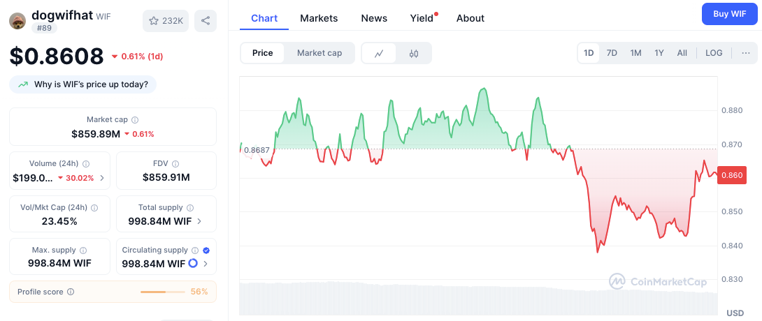 WIF, the Solana-based newcomer, trades at $0.861 after intraday swings. It rallied to $0.880 early in the session but later reversed sharply.