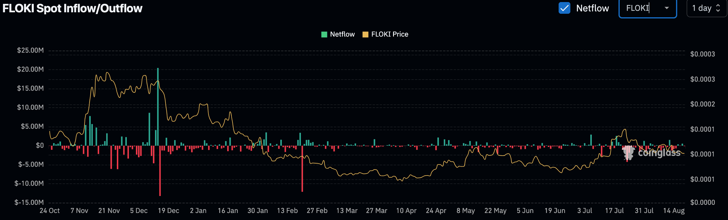 On August 19, FLOKI netflows showed -$117,260, with more tokens being withdrawn from exchanges than deposited. This may indicate lower immediate selling pressure, with stockholders moving assets off exchanges.