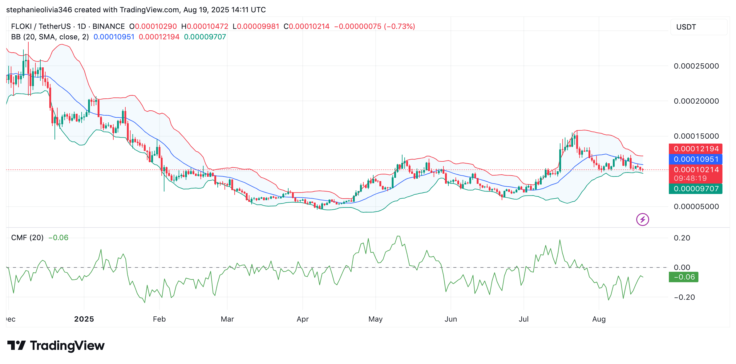 The Bollinger Bands are narrowing, with the upper band set at 0.000123 and the lower one at 0.000097. FLOKI trades close to $0.000103, sitting just under the mid-band at $0.00011. The constricting range indicates low volatility, which is often depicted prior to a bigger move.
