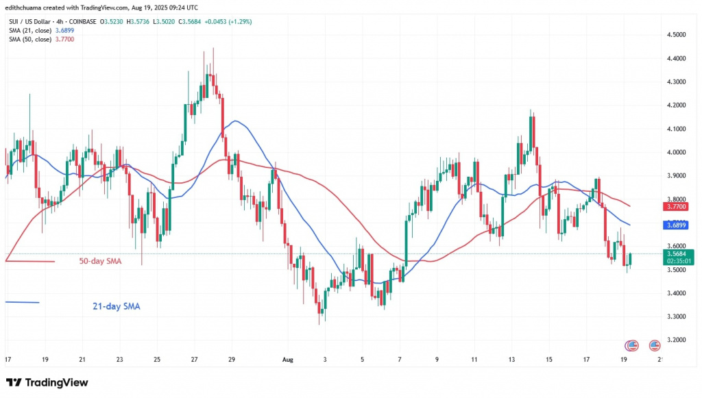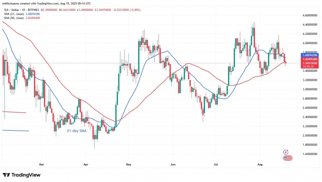 The price of Sui (SUI) is falling below the moving average lines as it continues to trade in a range between $3.20 and $4.20.