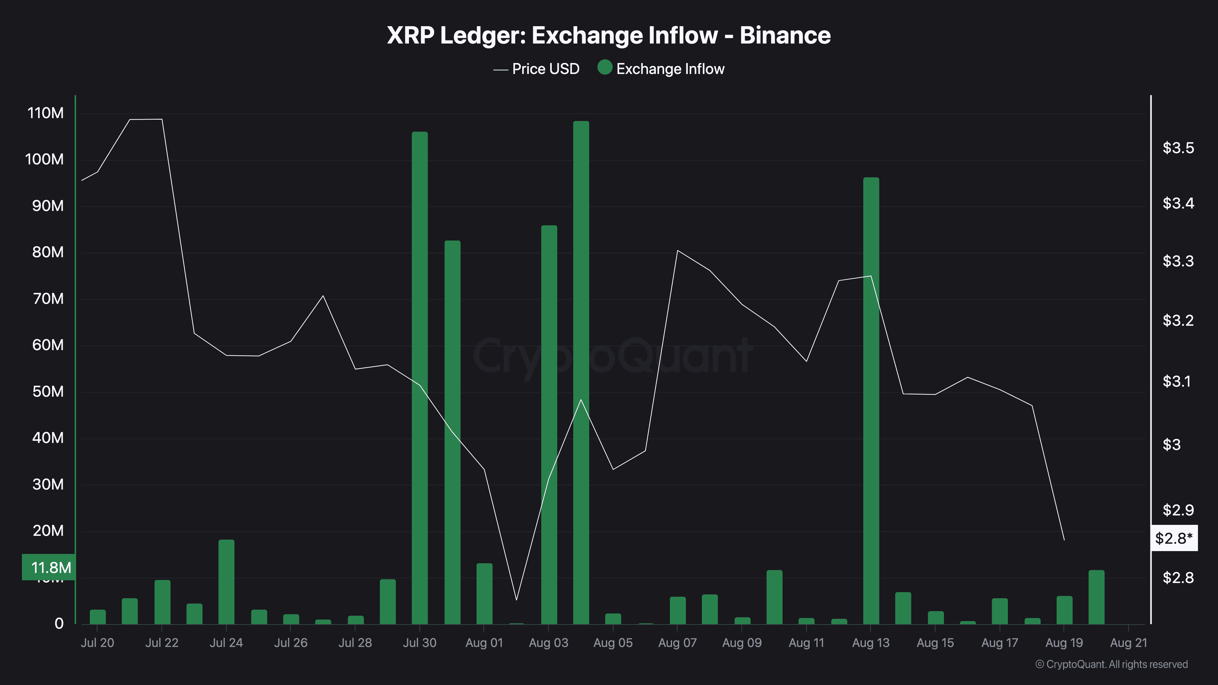 Notably, the selling activity has been visible on exchanges. Inflows of XRP to Binance increased through late July and August. The largest transfers reached more than 100 million XRP at a time, coinciding with the shift in price momentum. As of press time, another 11.8 million XRP entered Binance, keeping pressure on the market.