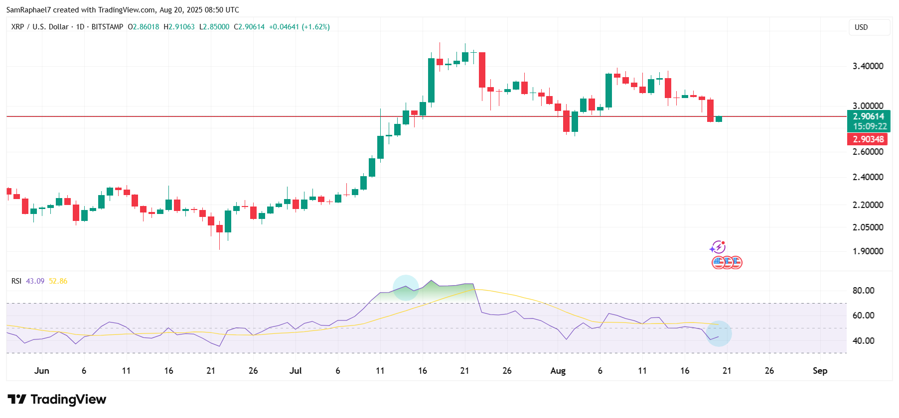 Despite it trading at $2.9 at press time, XRP’s daily RSI still stands at a low 43.05. Notably, when XRP traded for $2.9 in mid-July, its RSI was already overstretched at 83.69. However, it still saw a run to $3.66 days later. With the current 43.05 RSI value, XRP has much more room for growth. As a result, a recovery here could push prices to new highs.
