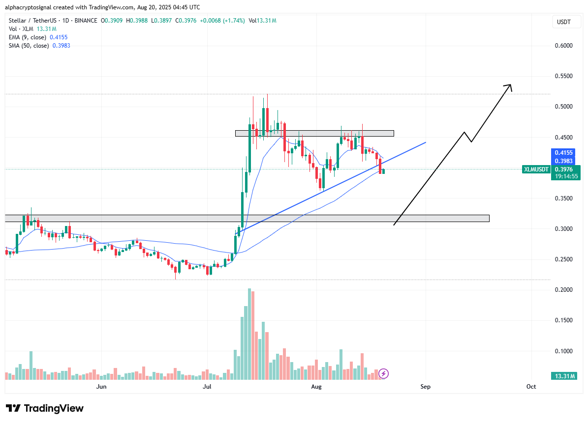 Stellar (XLM) is currently testing its trendline support after failing to break above the resistance zone near $0.45. If the support level holds, analysts expect a potential rebound with a retest of the $0.50–$0.55 range in September, as mentioned in our previous story.