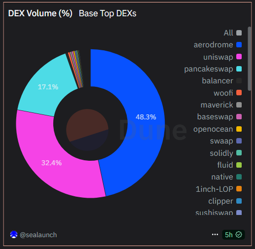 Since Coinbase integrated Aerodrome’s decentralized exchange (DEX) into its main app, Aerodrome now handles 48.3% of DEX volume on Base. It has even surpassed big names like Uniswap and Pancakeswap.
