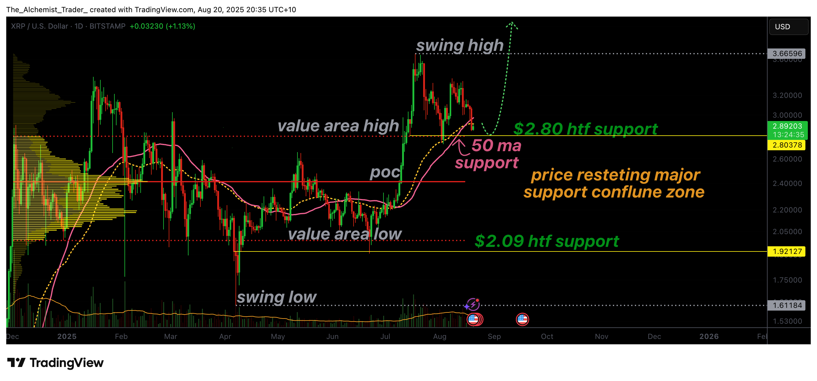 XRP has retraced into the $2.80 support zone, a level reinforced by the 50-day moving average and value area high. Strong bullish volume suggests the current retest could pave the way for another push toward record highs.