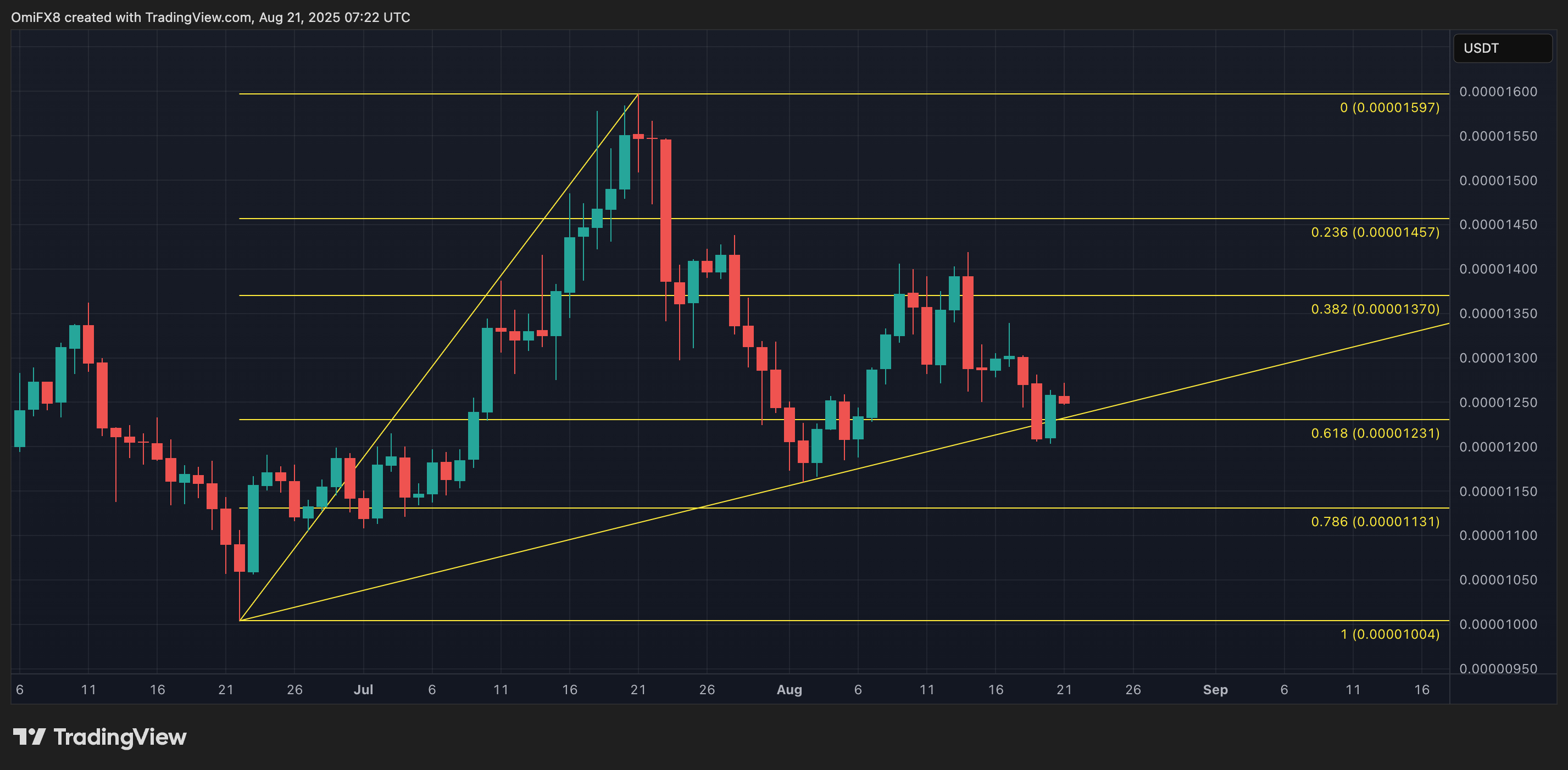Buyers, however, stepped in closer to the $0.00001200 level, ensuring that the psychological support was maintained. The subsequent recovery also lifted prices back above the ascending trendline connecting June 22 and Aug. 2 lows, and the key level of $0.00001231, which is the 61.8% Fibonacci retracement of the June-July rally.