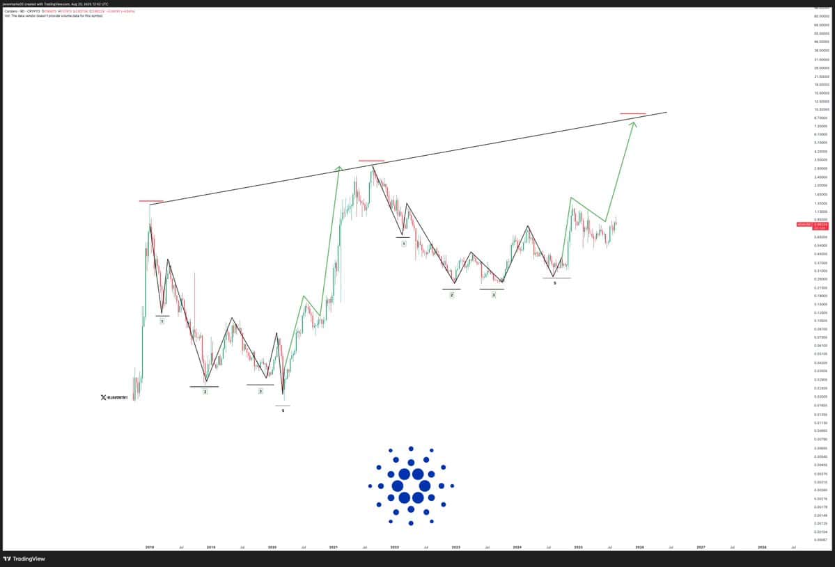 Analyst Javon Marks noted that Cardano’s current price structure is showing similarities to its previous market cycle. Charts comparing past and present cycles indicate that ADA may be forming the same corrective and impulsive phases that preceded its earlier rally.