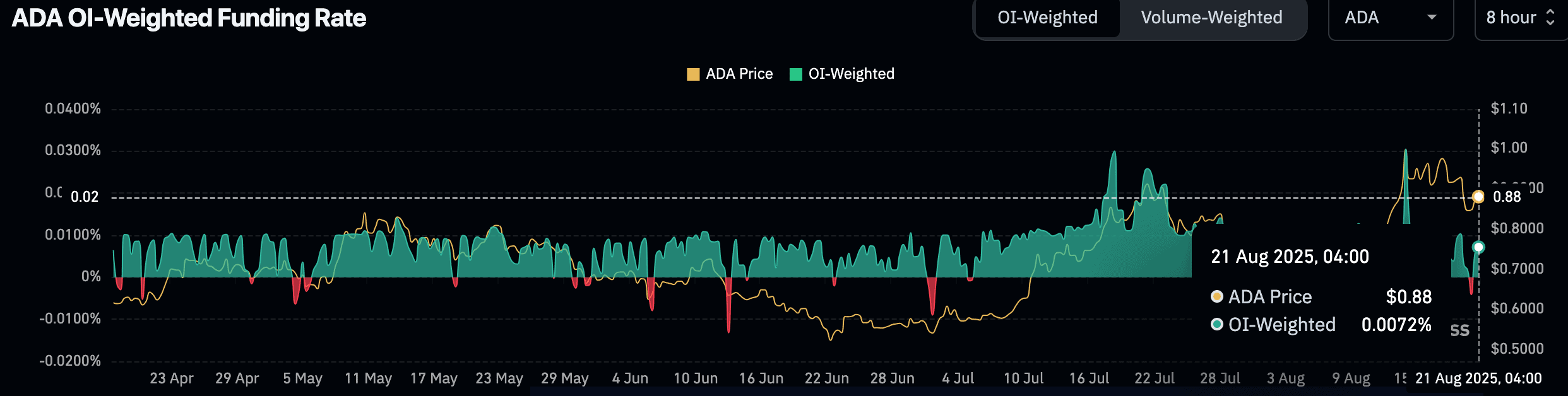 Futures and derivatives data also point to rising trader interest. Coinglass reported that ADA open interest dropped 4% to $1.61 billion, while trading volume fell 18% to $5.27 billion. Despite this, the funding rate flipped positive to 0.0072%, meaning long traders are paying shorts. Remarkably, such shifts have often been followed by price rallies, as seen in early July.
