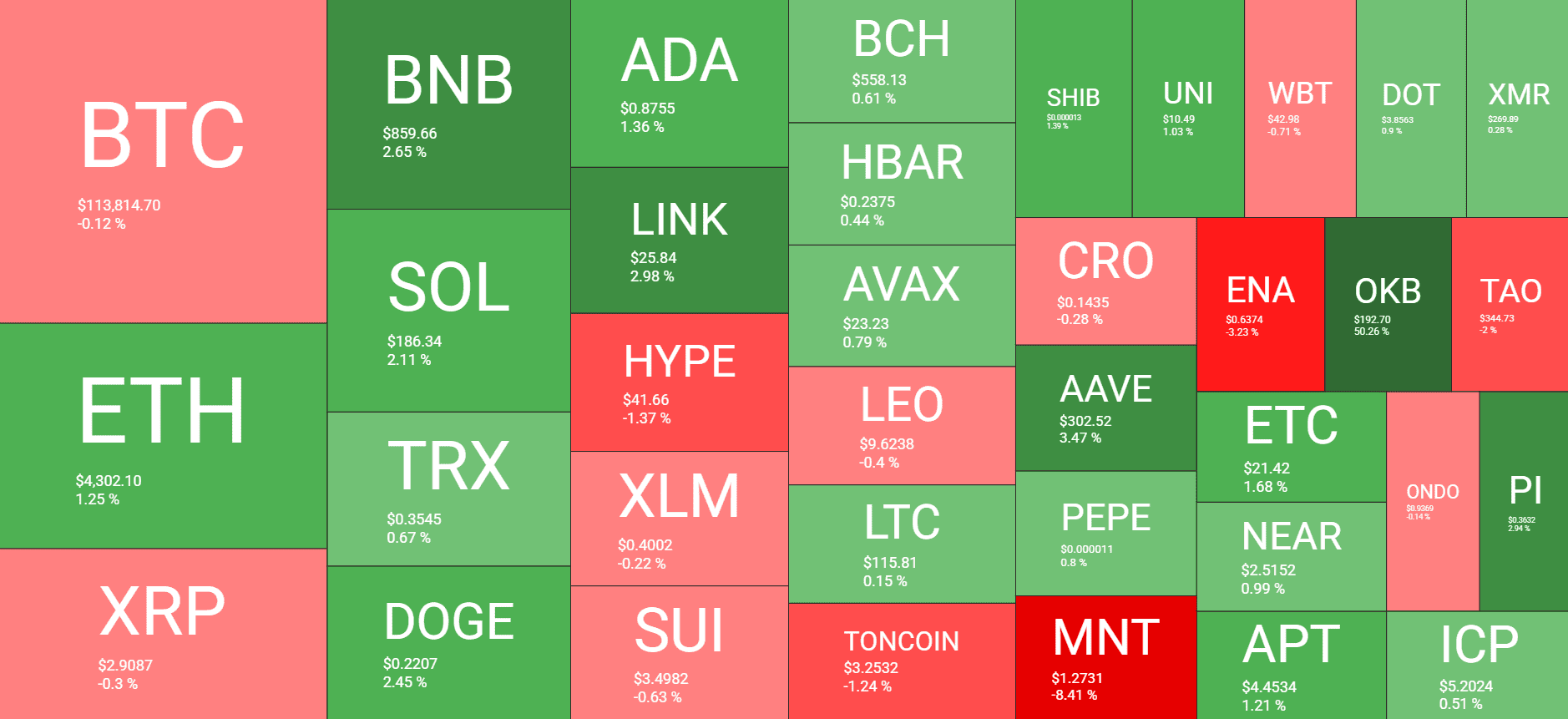 Ethereum has tapped $4,300 after a 1.25% daily increase, SOL has exceeded $185% after a 2% jump, and DOGE is above $0.22 following a 2.5% pump. LINK is close to $26, while ADA and TRX have posted more modest gains. In contrast, MNT has slumped by over 8% following its recent run.