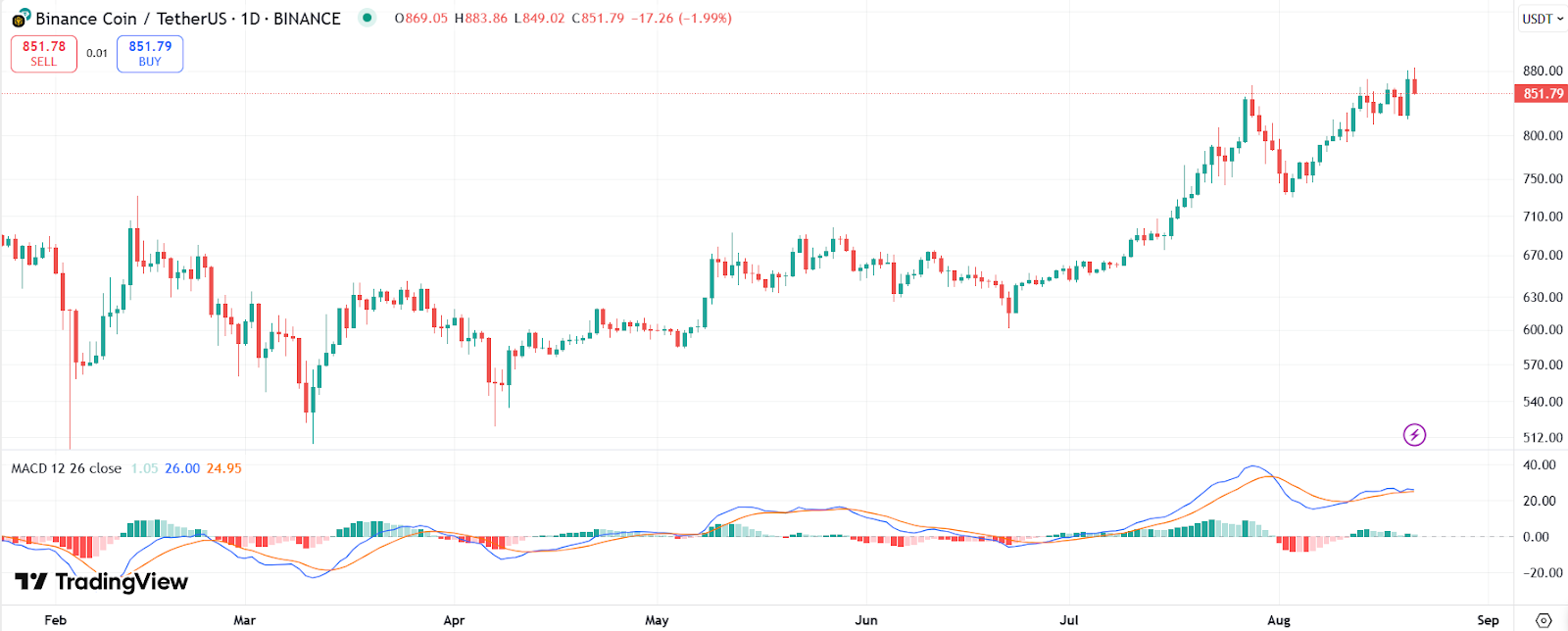 The price is hugging the upper Bollinger Band near $882, reflecting strong upward pressure. If BNB manages to sustainably close above the peak, traders could see a rally to $920 and even to $1,000.