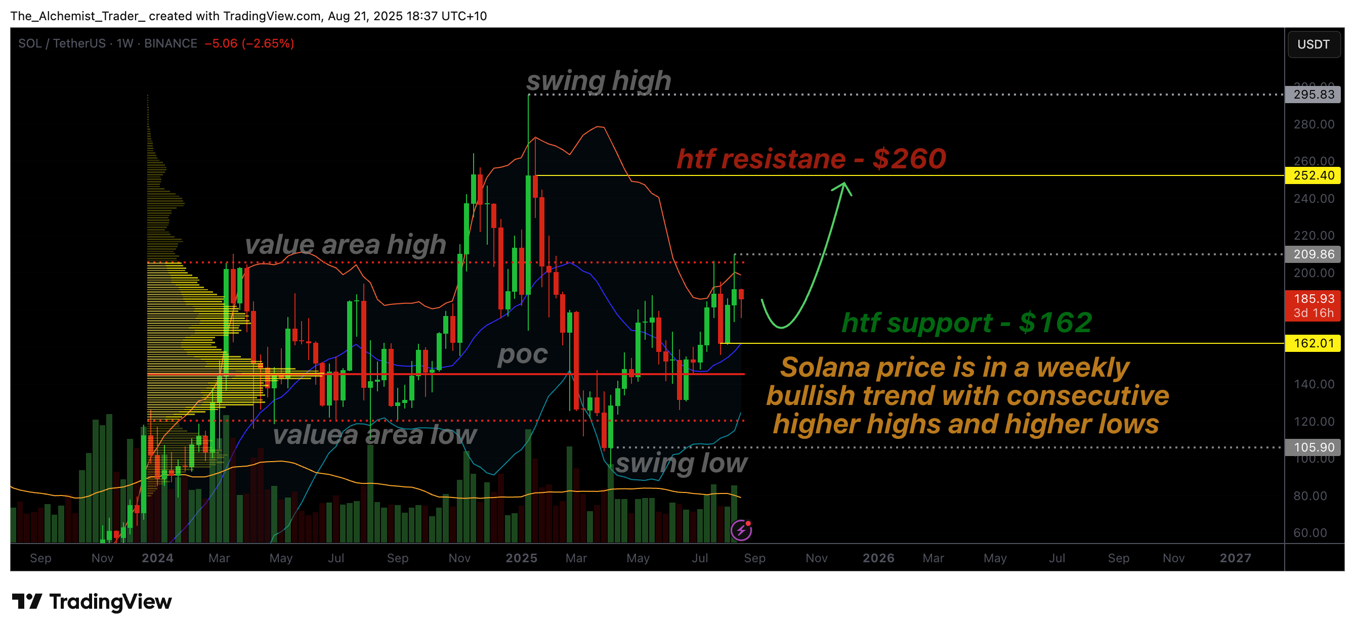 Solana continues to trend higher on the weekly time frame with consecutive higher highs and higher lows. The $162 support remains the foundation for continuation toward the $260 resistance.