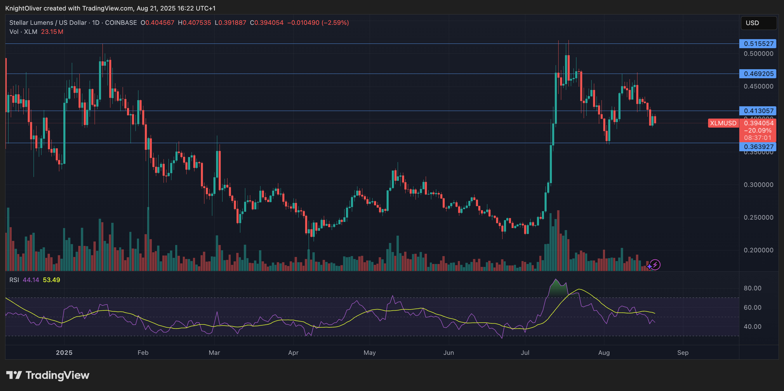 XLM traded in a narrow band between $0.39 and $0.41 over a 24-hour stretch ending Aug. 21, reflecting a consolidation phase ahead of a potential move. Sellers repeatedly capped upside at $0.41, while buyers defended support at $0.40, keeping volatility subdued. A gradual dip in volume suggested traders were positioning for a breakout attempt.