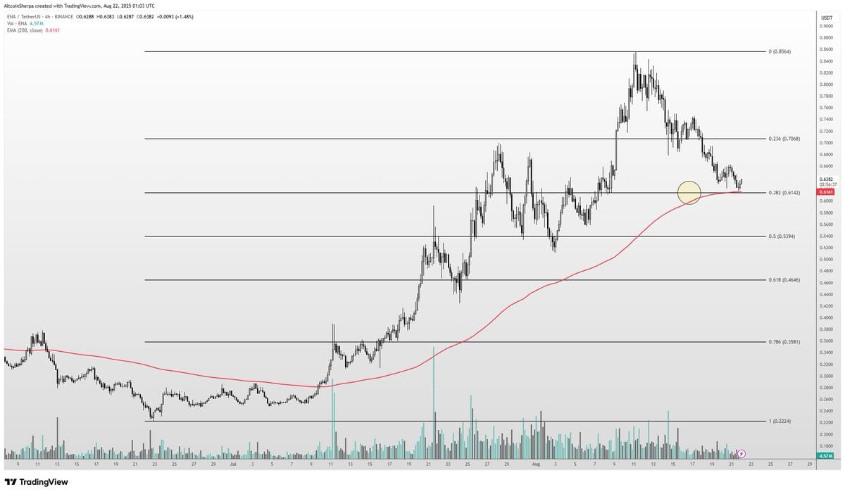 Technical trader Altcoin Sherpa posted a chart showing ENA trading around a confluence of key indicators. The recent price area is close to the 200-day EMA at $0.62, the 0.382 Fibonacci retracement at $0.61, and an older resistance level in late July. The coincidence of these factors indicates a potential support zone.