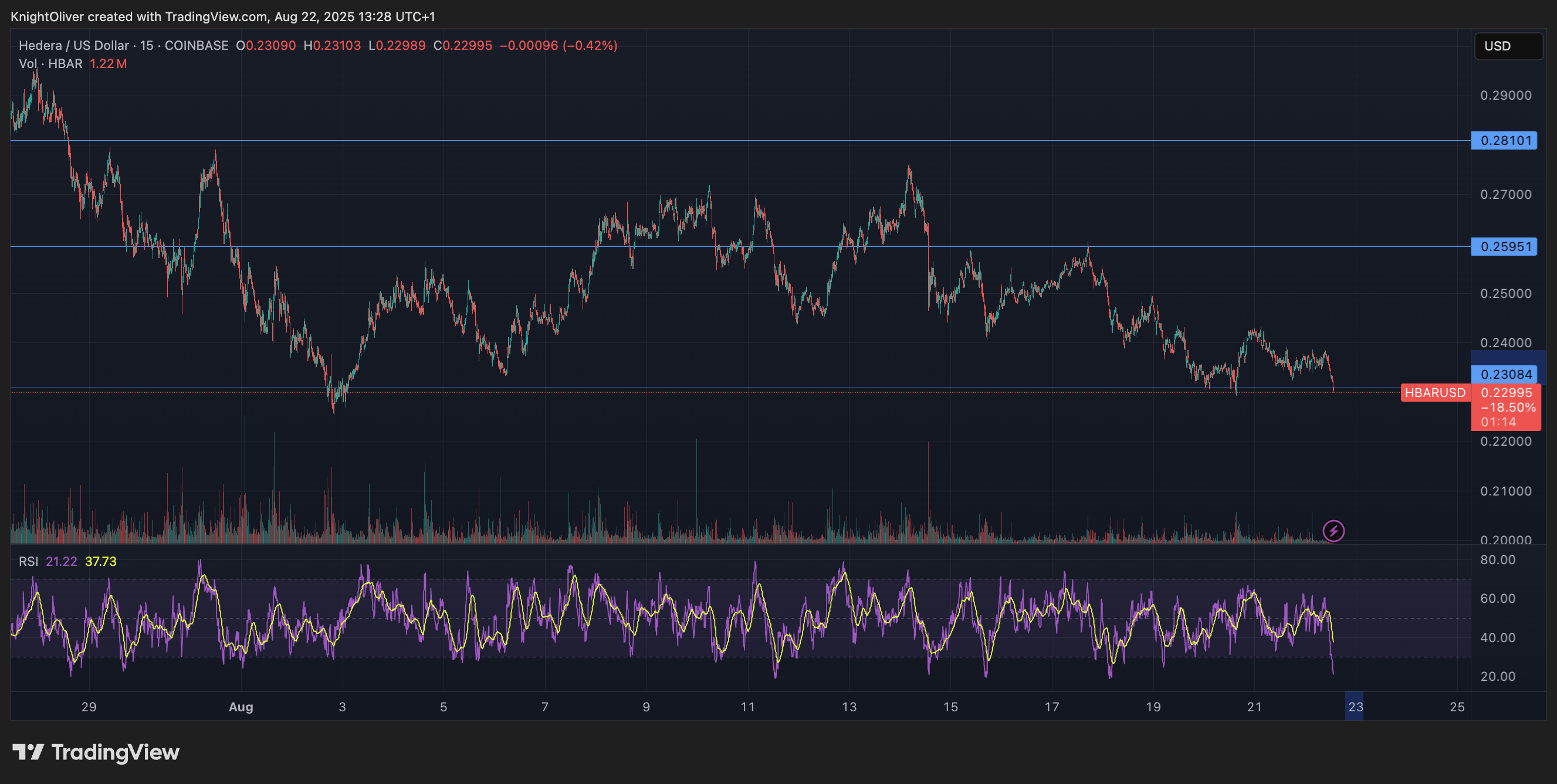Hedera’s native token HBAR is testing a key level of support at $0.23 after selling off by more than 3% on Friday.