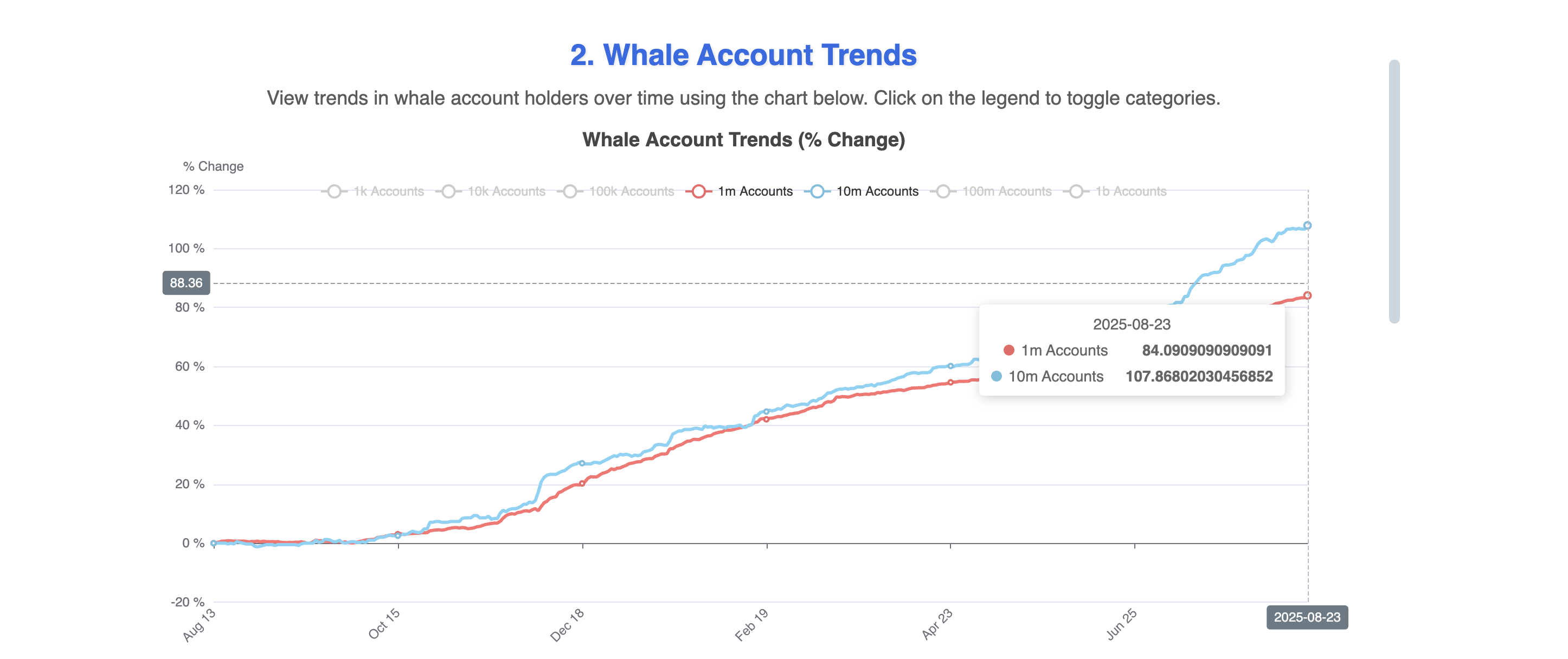 Over the past week, large HBAR holders have expanded their positions. Accounts holding at least 1 million tokens grew from 82.41 on August 16 to 84.09 on August 23. Similarly, the 10 million token band rose from 106.59 to 107.86 during the same period.