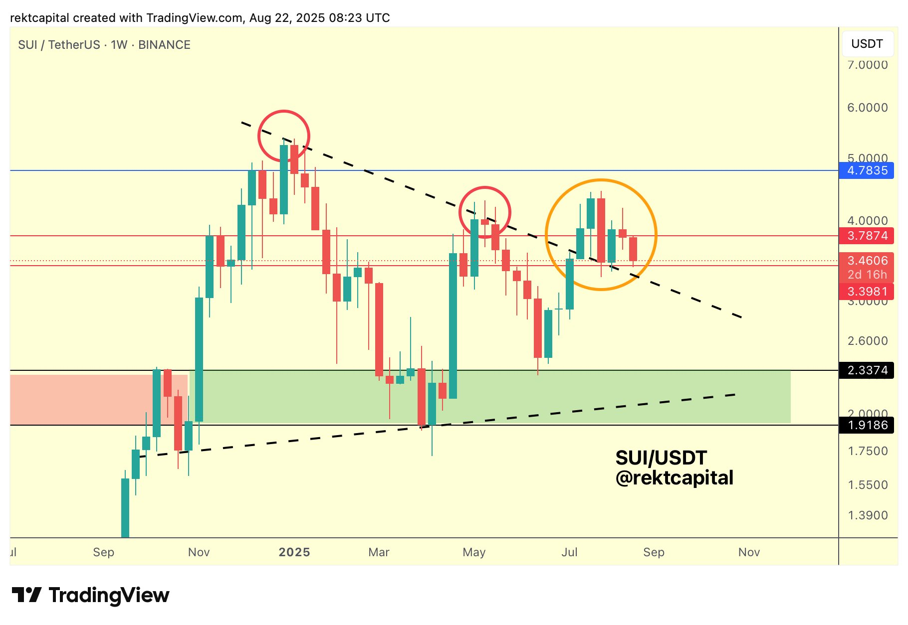 - Popular analyst Rekt Capital predicts SUI price could rally after confirming the macro triangle pattern breakout.