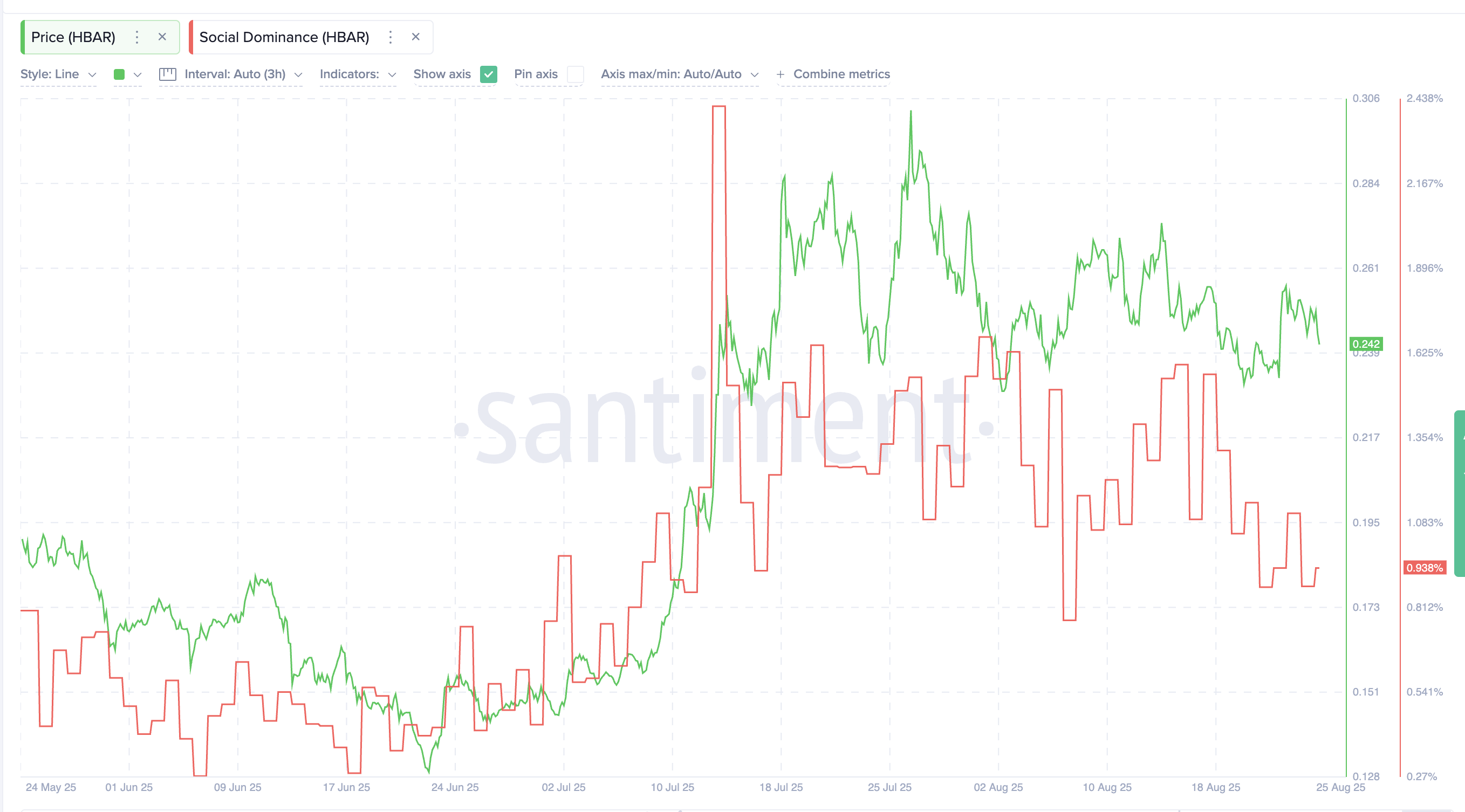 One reason for caution comes from HBAR’s fading visibility in the market. Since mid-July, HBAR’s social dominance has fallen nearly 90%, dropping from a high of 2.41% on July 13 to 0.93% now. That is a steep decline in chatter and attention.