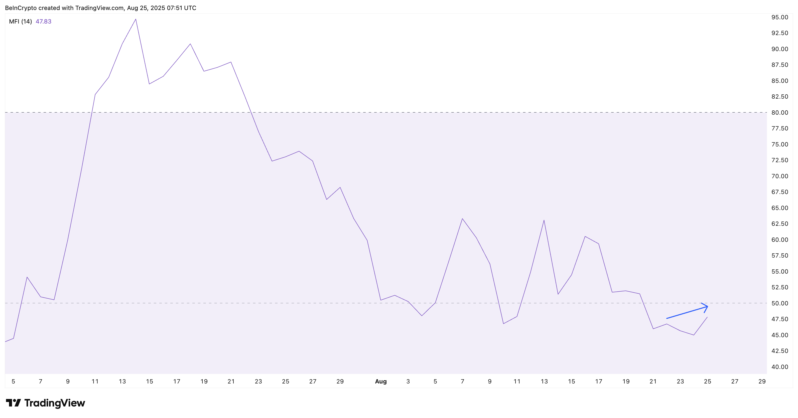 For now, buyers are still active. The Money Flow Index (MFI), which tracks capital entering or exiting an asset, has picked up from 45 to 47.8 while the price eased lower.