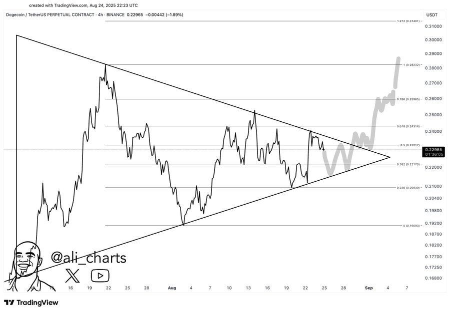 Meanwhile, crypto analyst Ali Martinez suggested that Dogecoin may be preparing for a bullish breakout after one final pullback. In a 4-hour chart shared on X, Martinez highlighted a symmetrical triangle formation, noting that DOGE could see a brief dip toward the $0.22 support zone before rallying higher. Notably, Dogecoin currently trades at this level.
