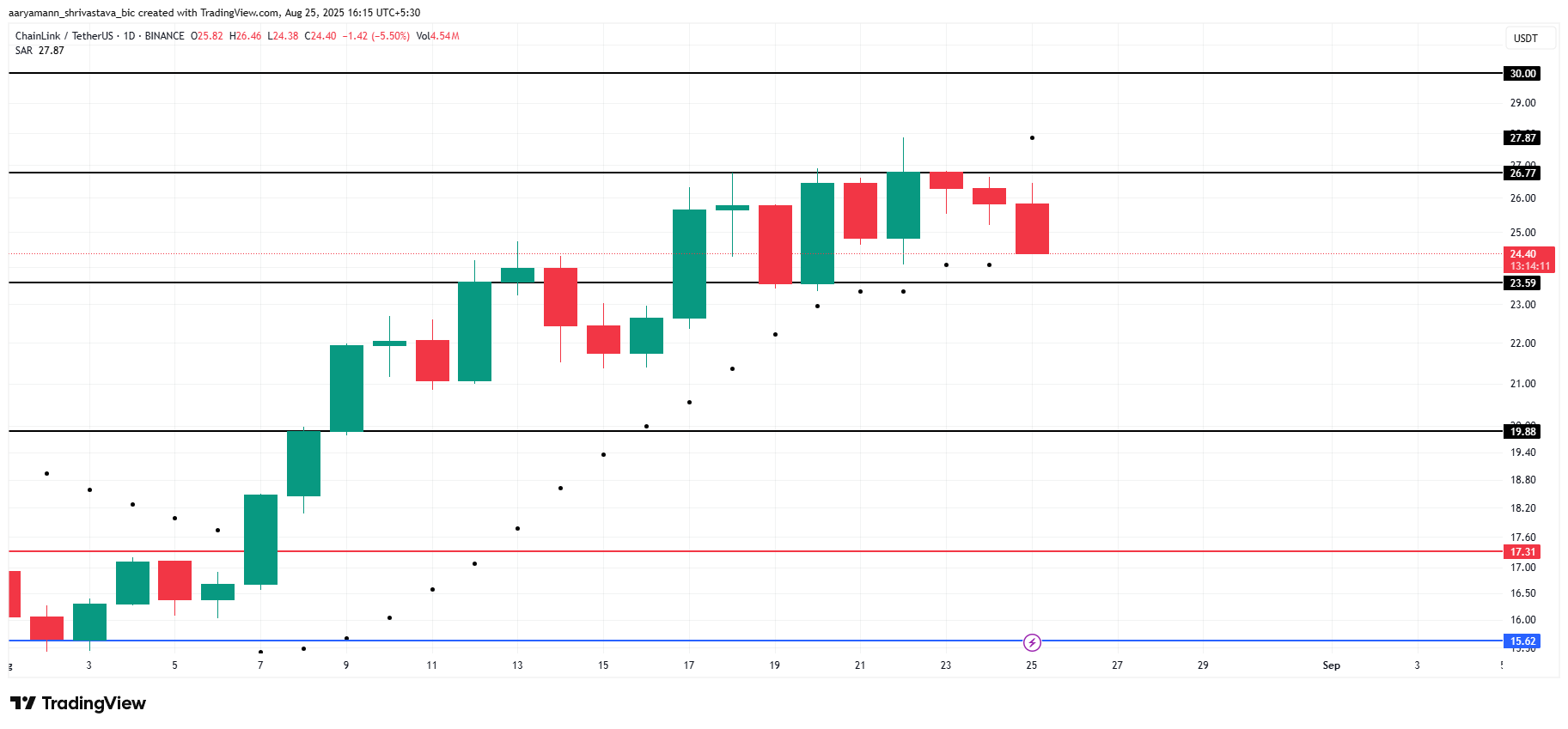 LINK is currently priced at $24.4, experiencing a downtrend. The Parabolic SAR indicator above the candlesticks confirms the bearish sentiment, signaling potential continued downside. However, the market could shift if positive catalysts or investor sentiment change in the near future, prompting a potential reversal in the trend.