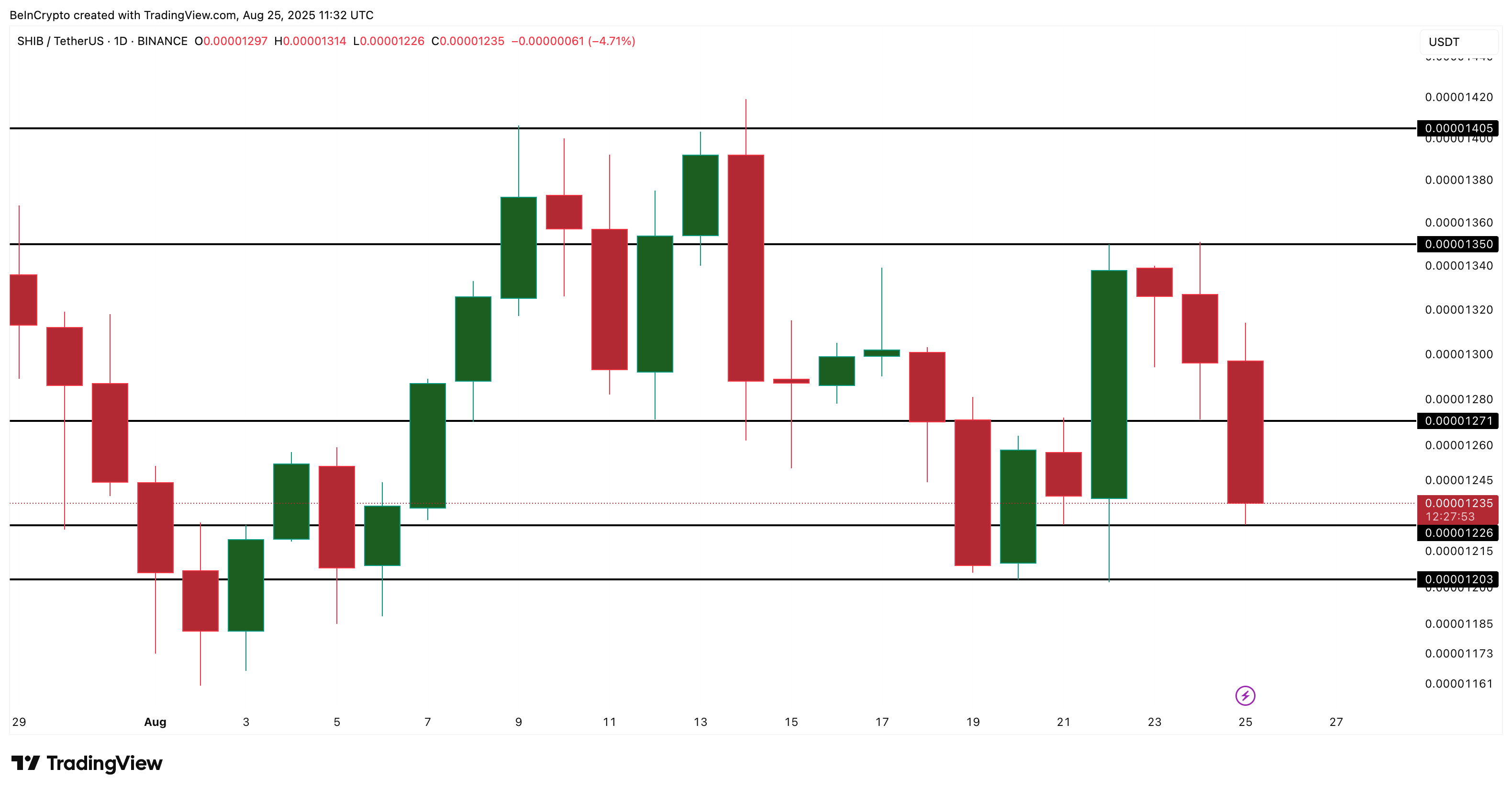 The broader structure still leans fragile. The Shiba Inu price is trading at $0.00001235, sitting just above the heavy accumulation zone near $0.00001203.