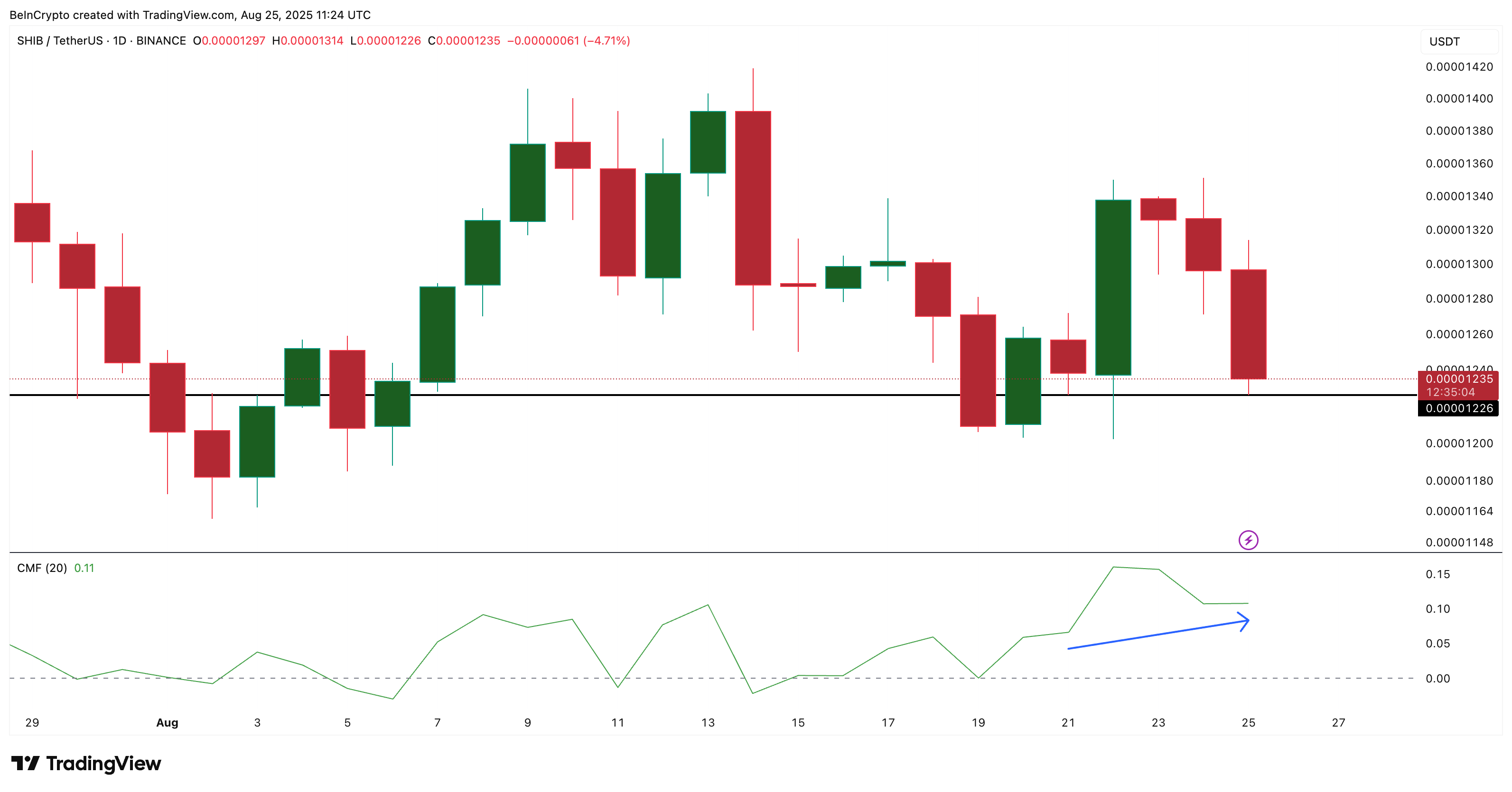 This band has acted as strong support in the past, and the fresh inflows help explain why the Shiba Inu price has held here. Also, per the CMF hypothesis, the $0.00001226 is also a key support for SHIB, considering fresh buying was seen at that level.