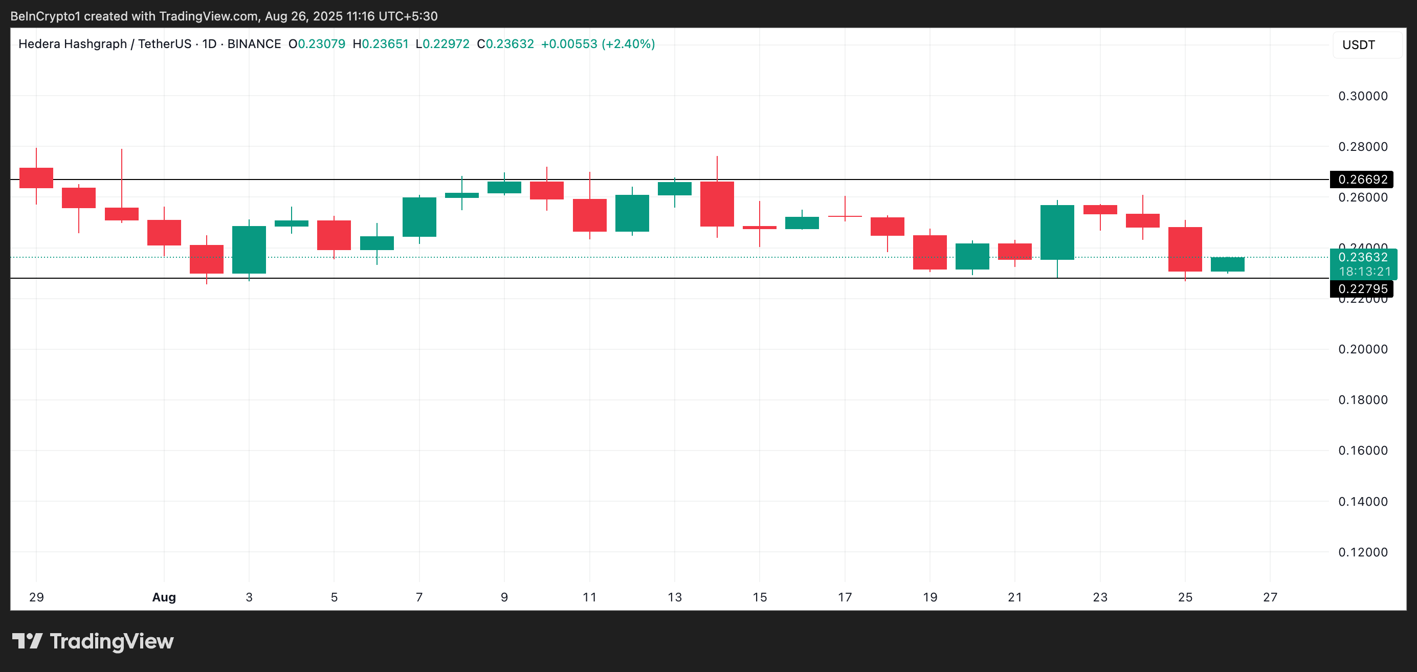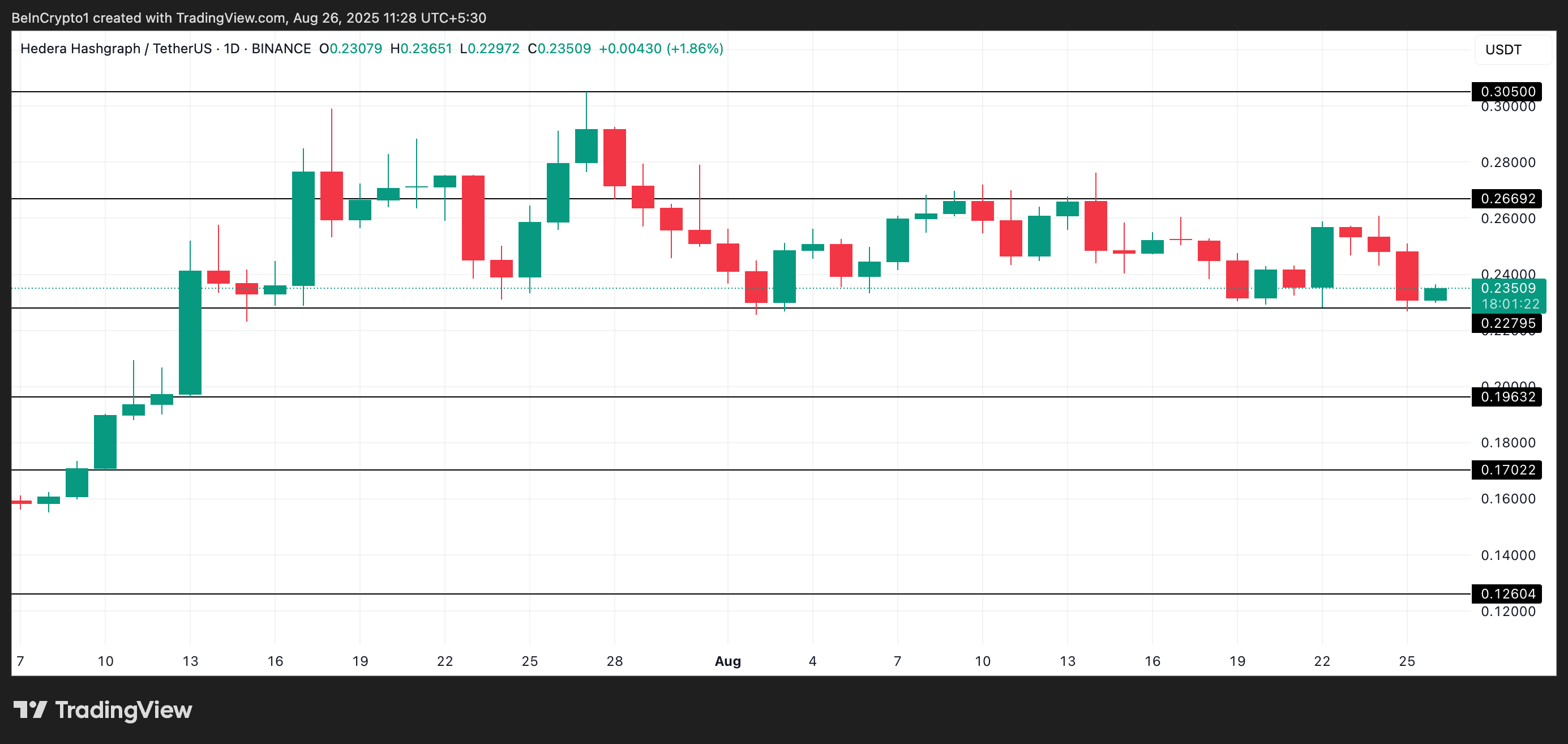 Readings from the HBAR/USD one-day chart show the altcoin trading within a horizontal channel. After July’s rally drove HBAR to a cycle peak of $0.30 on July 27, the token has since lost upward momentum and fallen into consolidation.