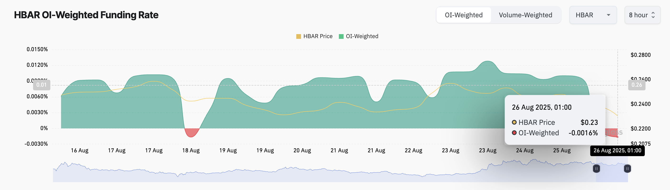 For HBAR, the negative flip in its funding rate shows that its futures traders are increasingly positioning for downside, worsening the risk of a breakdown below its current support zone.