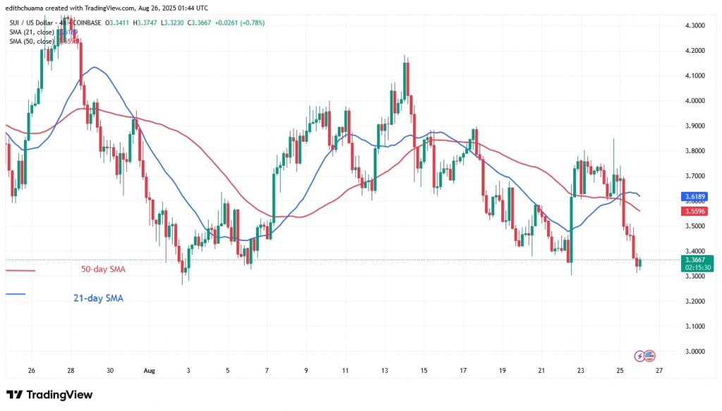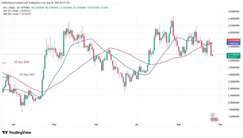Today, on August 26, the cryptocurrency is rising as it remains above the lower price range of $3.20. On the upside, SUI will gain momentum as buyers push the price above the moving average lines. The altcoin will rise to its previous high of $4.40.