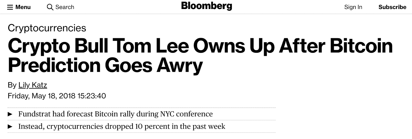 As far as I can tell, his first public predictions for crypto came in mid-2017. Bitcoin’s price had more than doubled in the first six months of the year, to $2,500, leading Lee to call bitcoin’s future price on at least 10 different occasions in the 10 months ending May 2018.