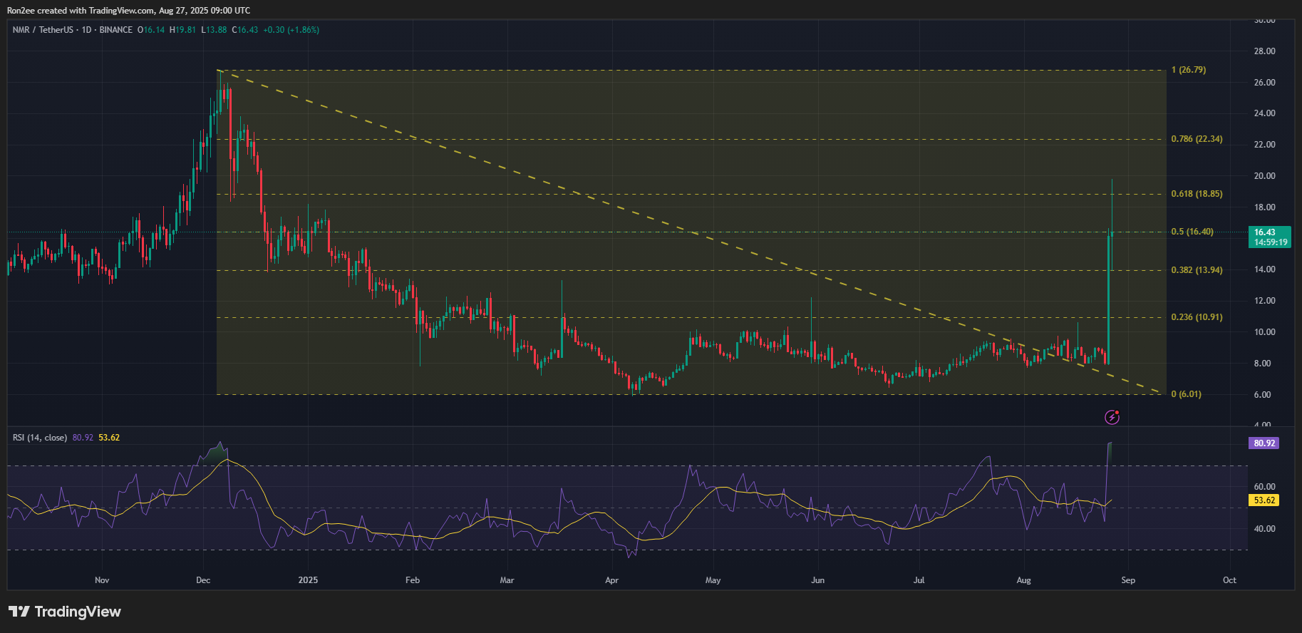 According to data from crypto.news, Numeraire (NMR), the native token of the crowdsourced quant hedge fund Numerai, surged 142% to an intraday high of $19.55 on Aug. 27, marking its highest level since December of last year.
