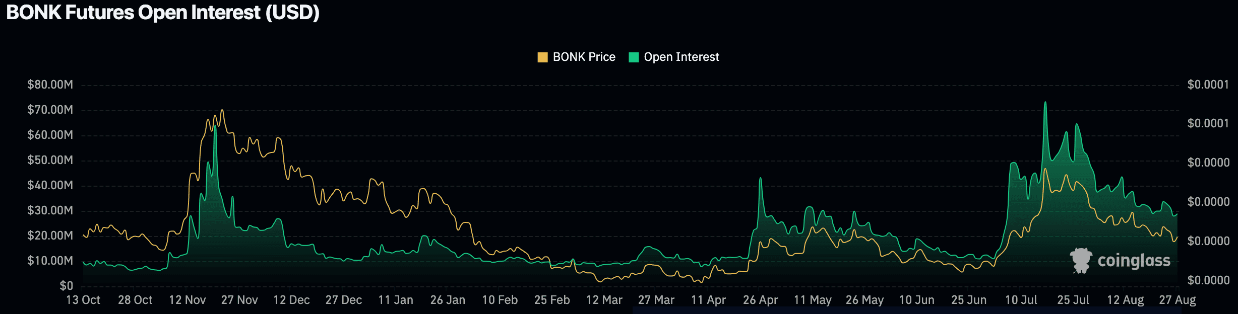 While the chart shows a bullish structure, broader market data reflects lower activity. Open Interest (OI) in BONK futures contracts is around $29 million, according to CoinGlass, down from a peak of $73 million in July. The decline in OI suggests lower participation and reduced risk appetite among traders.