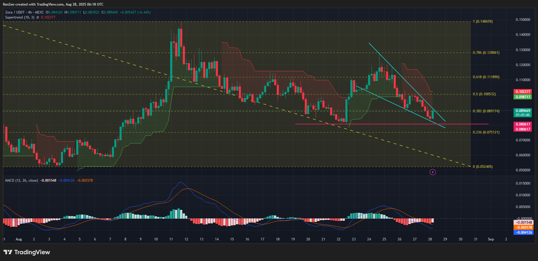 As of press time, ZORA is approaching a breakout above the upper trendline near the $0.090 level. A confirmed move above this resistance could open the door to a short-term recovery.