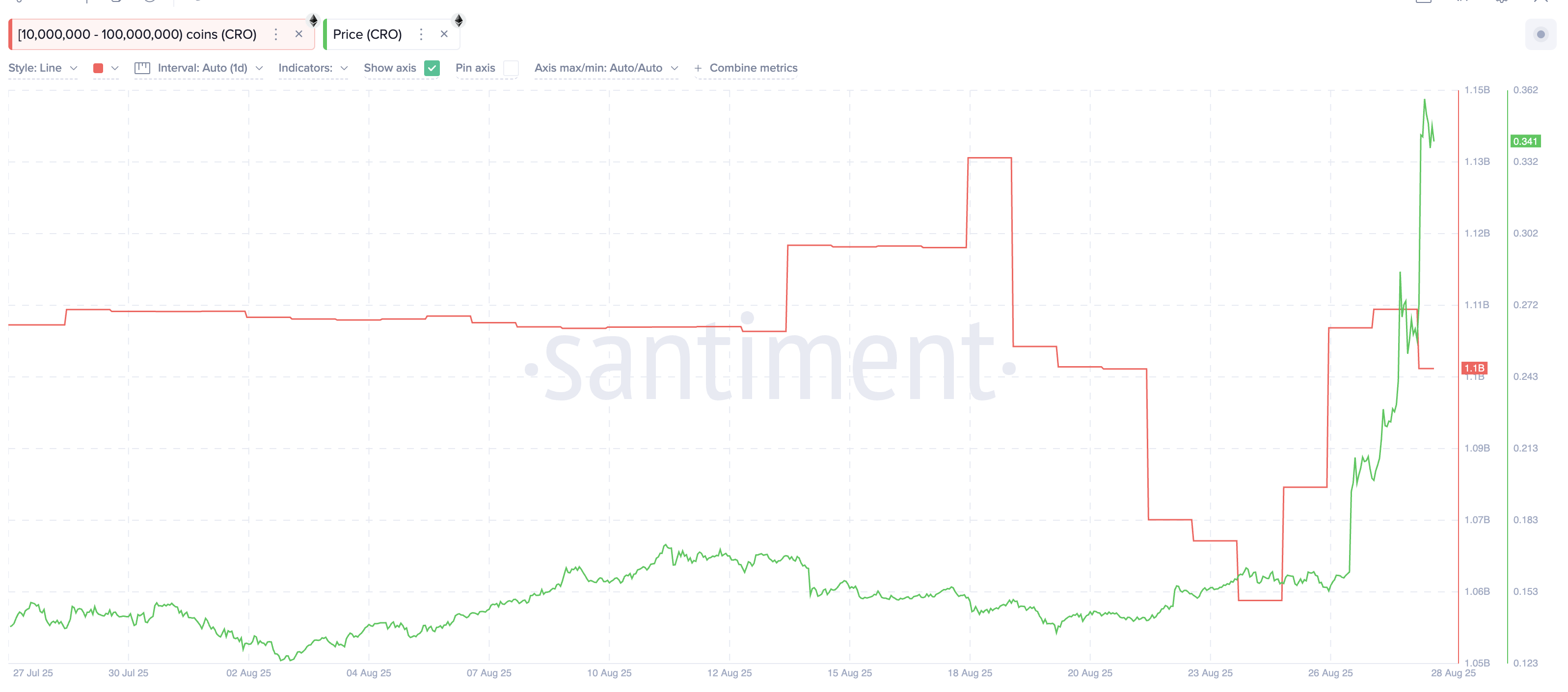For the first time in nearly two weeks, large holders in the 10 million–100 million CRO cohort have reduced their positions. Their wallets fell from 1.11 billion CRO to 1.10 billion CRO, a cut of roughly 100 million CRO worth $34 million at current prices.