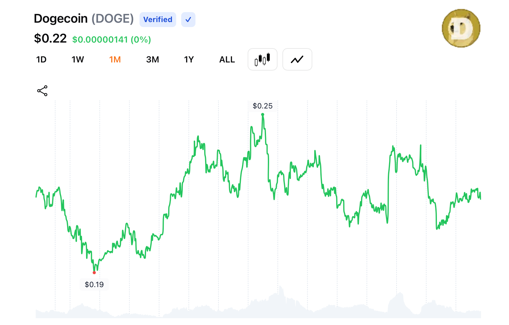 Dogecoin (DOGE) 30-day view on Aug. 28, 2025.