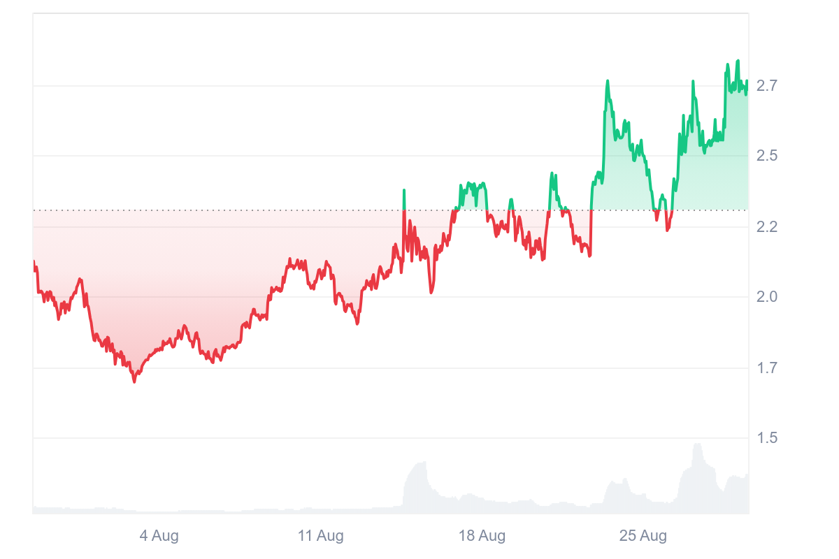 The altcoin has held above a rising trendline since its breakout from a low of $1.69 on August 2, 2025.