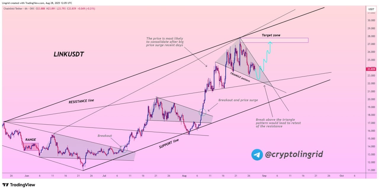 From a technical perspective, analyst Lingrid stated that LINK is locked in a tight triangle formation after its previous major rally. The price structure remains biased toward trend continuation, especially if buyers successfully reclaim the last breakdown line and establish it as new support.