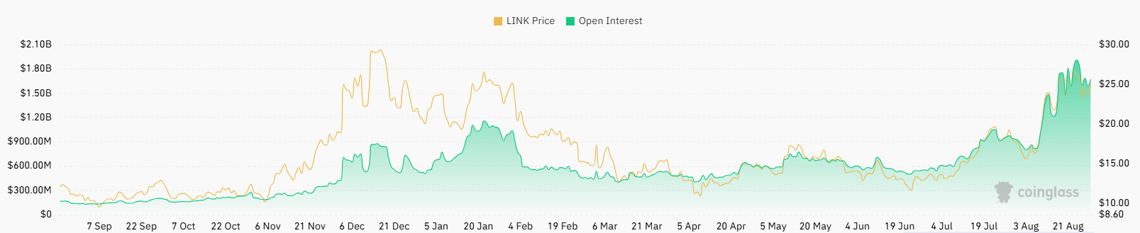 Data from CoinGlass shows a sharp surge in activity. LINK derivatives volume rose more than 114% to $5.82 billion. However, open interest actually decreased slightly by 5.69% to $1.52 billion.