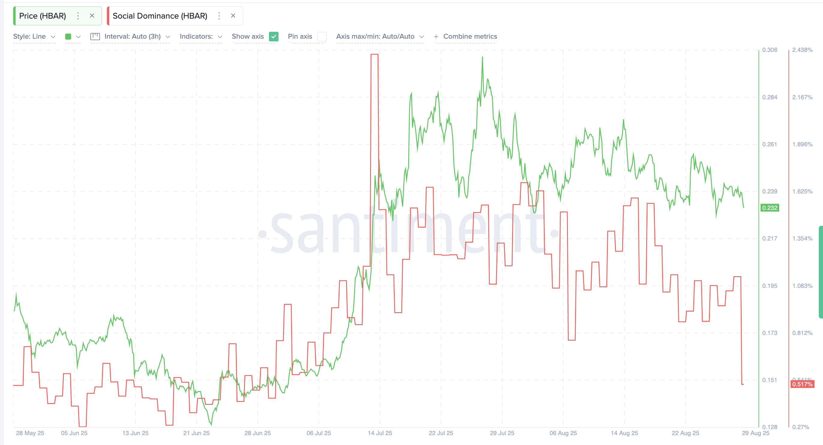 A look at on-chain data shows why buyers have stepped back. Hedera’s social dominance, which tracks how much discussion it generates across crypto platforms, has collapsed.