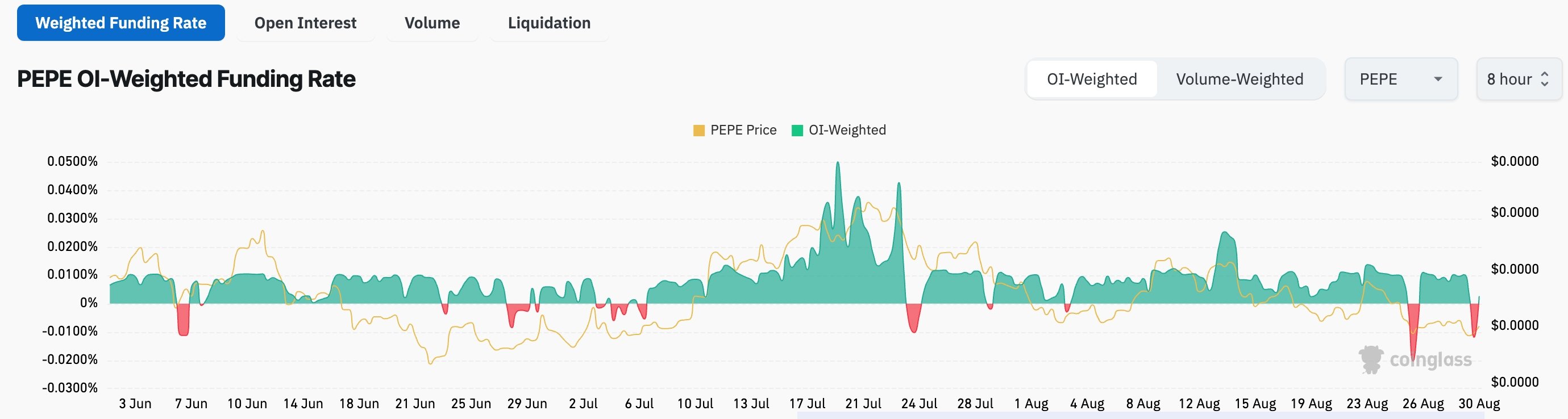 CoinGlass data indicates that Pepe may be at risk as liquidations surge, the weighted funding rate turns negative, and open interest declines.