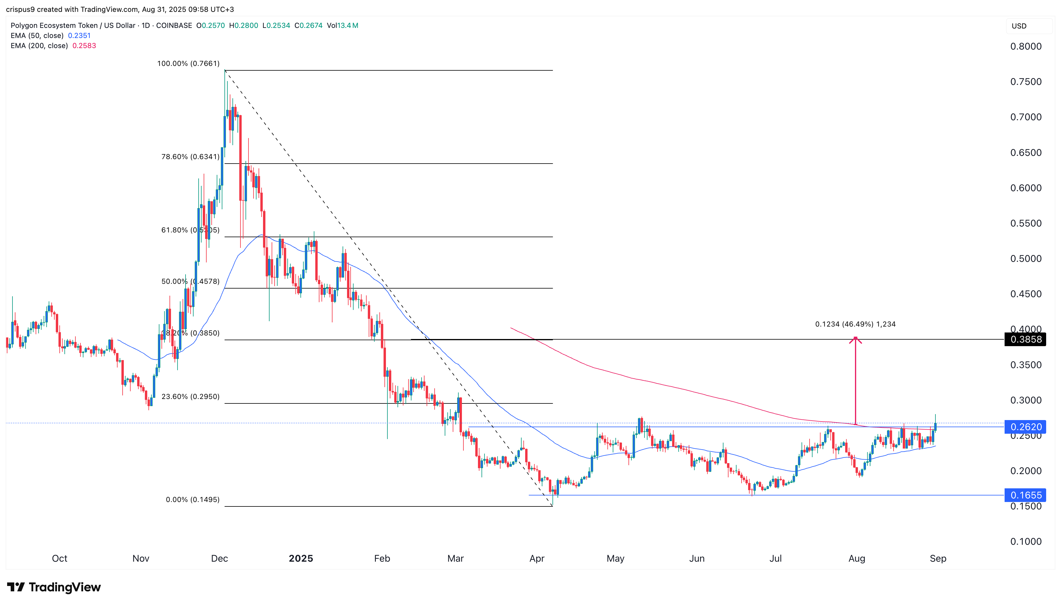 The daily timeframe chart shows that the POL price bottomed at $0.1655 in June and has been rising since then. It has flipped the important resistance level at $0.2620, the highest swing on July 22. It then retested the crucial $0.2796, the neckline of the double-bottom at $0.1655.