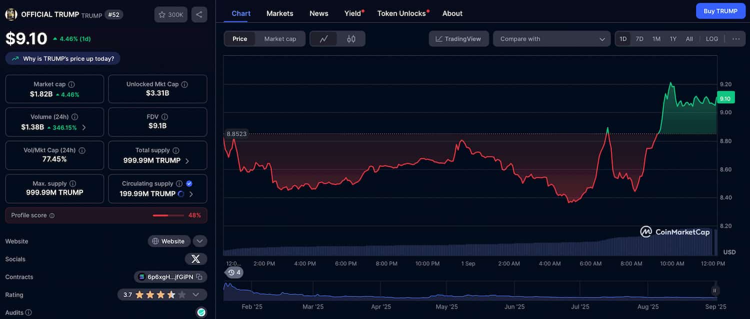 Official Trump (TRUMP) rallied 4.46% in the past 24 hours to $9.10, while trading volume surged 346% to $1.38 billion. The move outpaced the broader crypto market’s 0.4% gain, with traders tying the spike to the launch of a Trump-linked DeFi project.