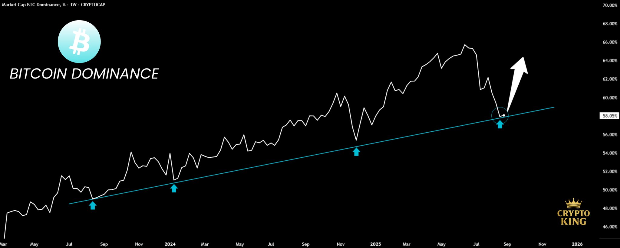 “Bitcoin dominance is holding strong at support. A bounce from here could send dominance back toward 63%+. That means altcoins may face more pressure before the next big run,” Crypto King predicted.